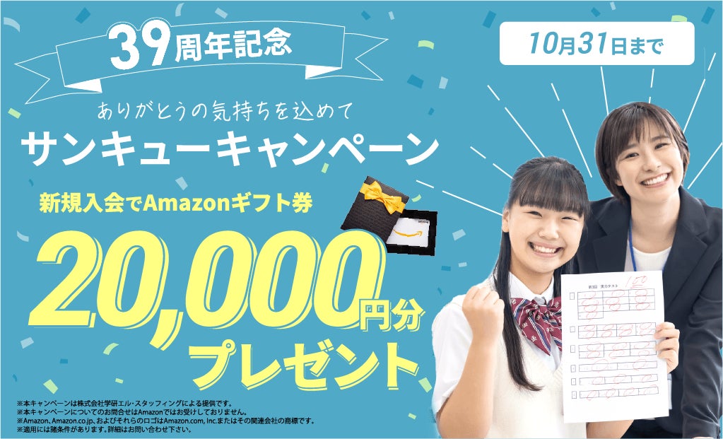 「学研の家庭教師」で、秋のサンキューキャンペーンを開始! 新規ご入会でAmazonギフト券20,000円分プレゼント!