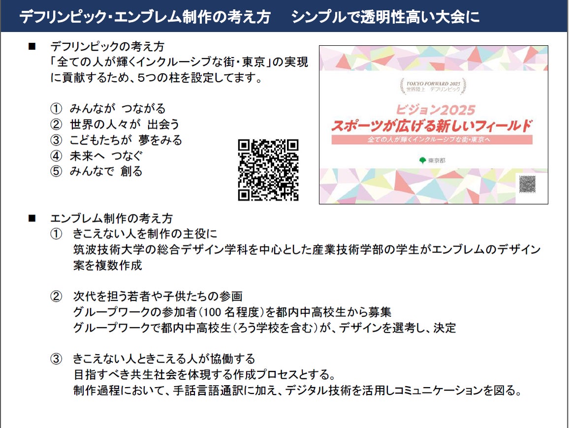 東京で開催されるデフリンピックなので、エンブレムには、未来のデフの子供たちが活躍できる機会が増える