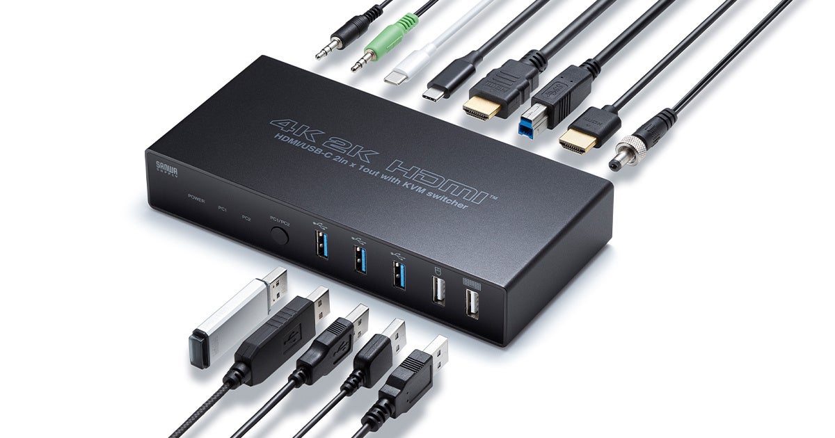「SW-KVM2DK」は、複数の周辺機器をパソコン2台で切り替えて使えるパソコン切替器です。