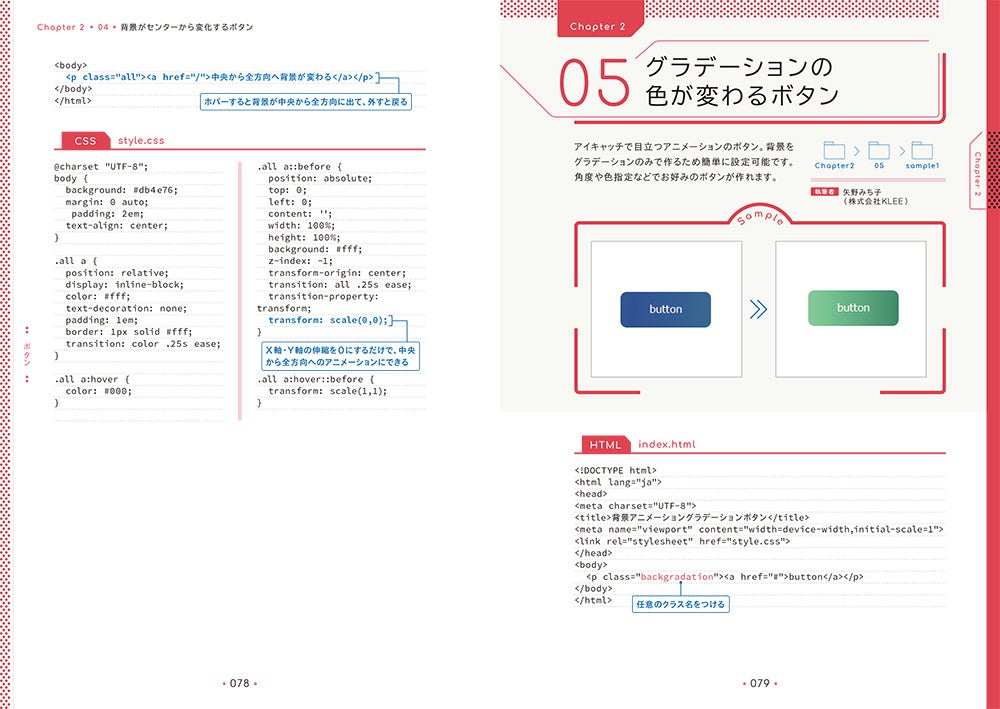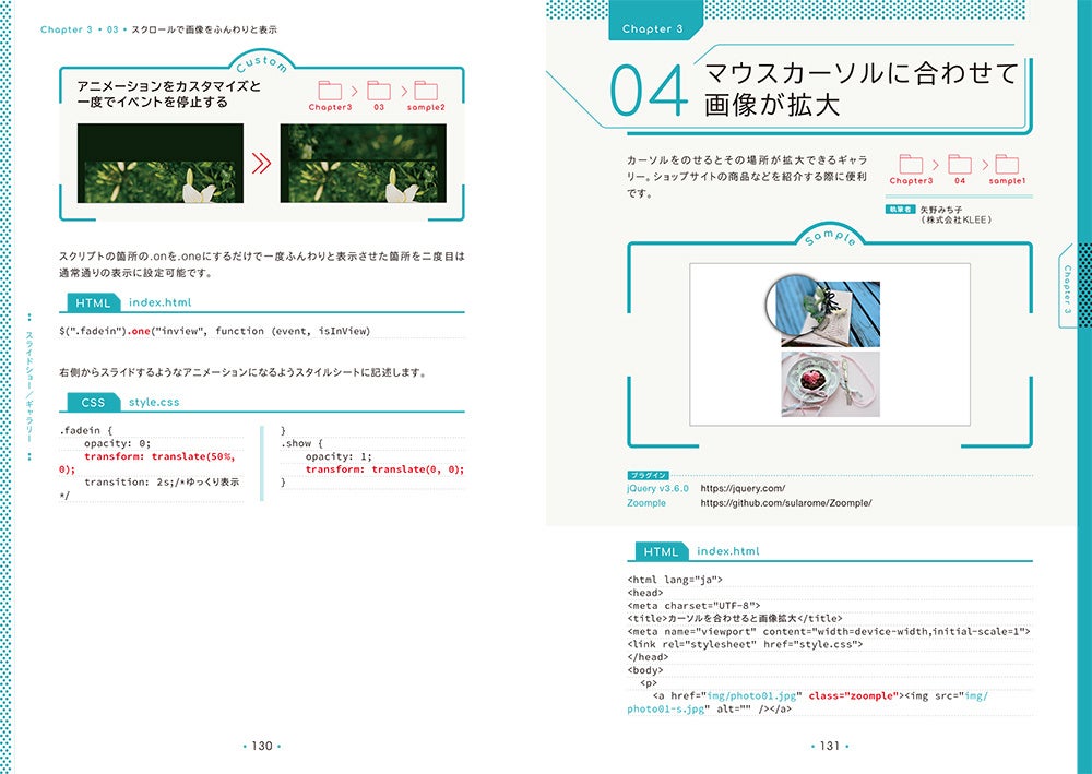 文字や画像がすぅーっと消えたり、ふわっ〜と表れたり、要素が左右にスライドしたり……作るのが意外に難しく汎用性が高い「動く」パーツを豊富に収録しました。収録サンプルは完成データをダウンロードできます。