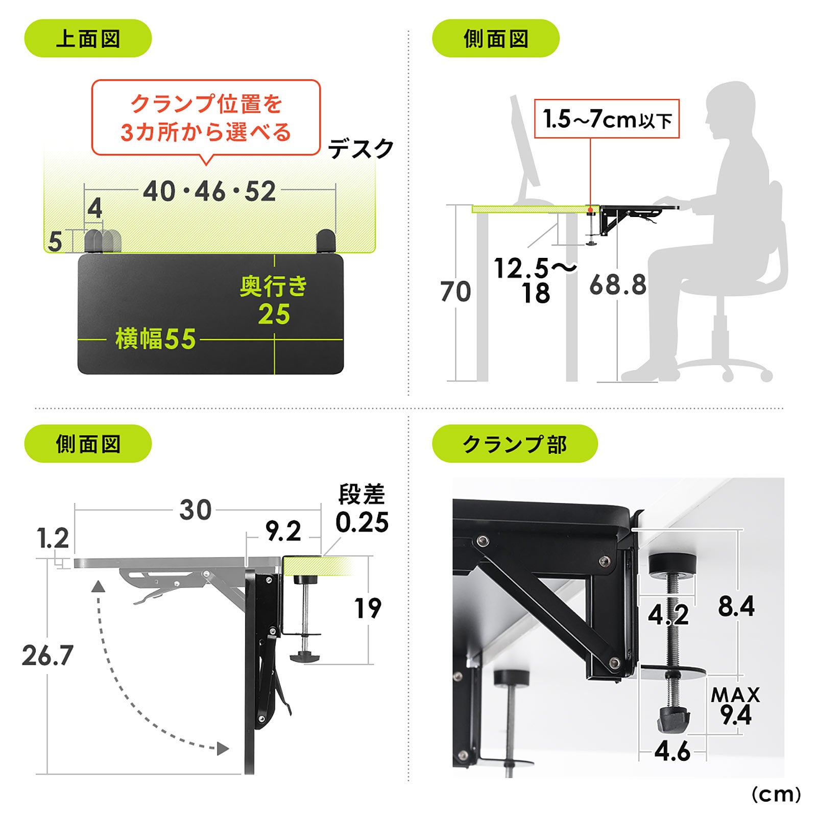 デスクエクステンダー 机 天板拡張 後付 折りたたみ テーブル拡張 クランプ固定 キーボードトレー 幅55cm 奥行25cm