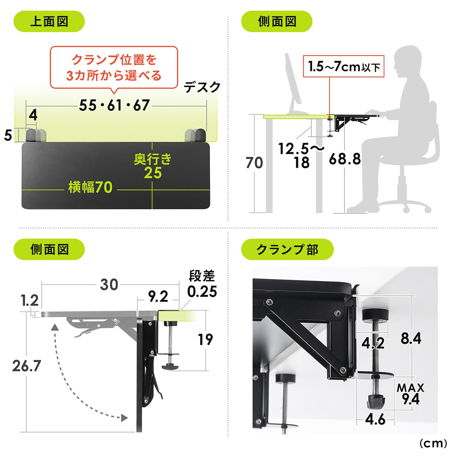 デスクエクステンダー 机 天板拡張 後付 折りたたみ テーブル拡張 クランプ固定 キーボードトレー 幅70cm 奥行25cm