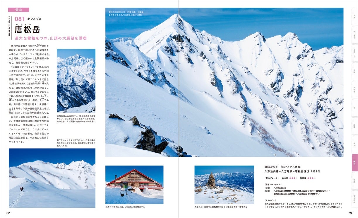 日本アルプス全体を把握でき、計画にも役立つ綴じ込みマップ付いています。また、難所が続く穂高連峰や剱岳エリアに対応し、核心部の詳細攻略マップも掲載しています。コースガイド記事と合わせて、コースの状況を詳しく知ることができます。