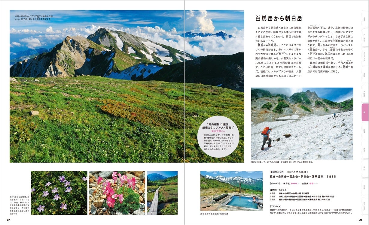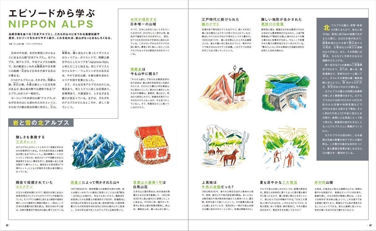日本アルプスの自然や歴史をより深く知ることができるコラムも充実。歩いたことのあるコースを振り返ったり、いつかは行きたいと思いを馳せたり、さまざまな楽しみ方ができる1冊です。