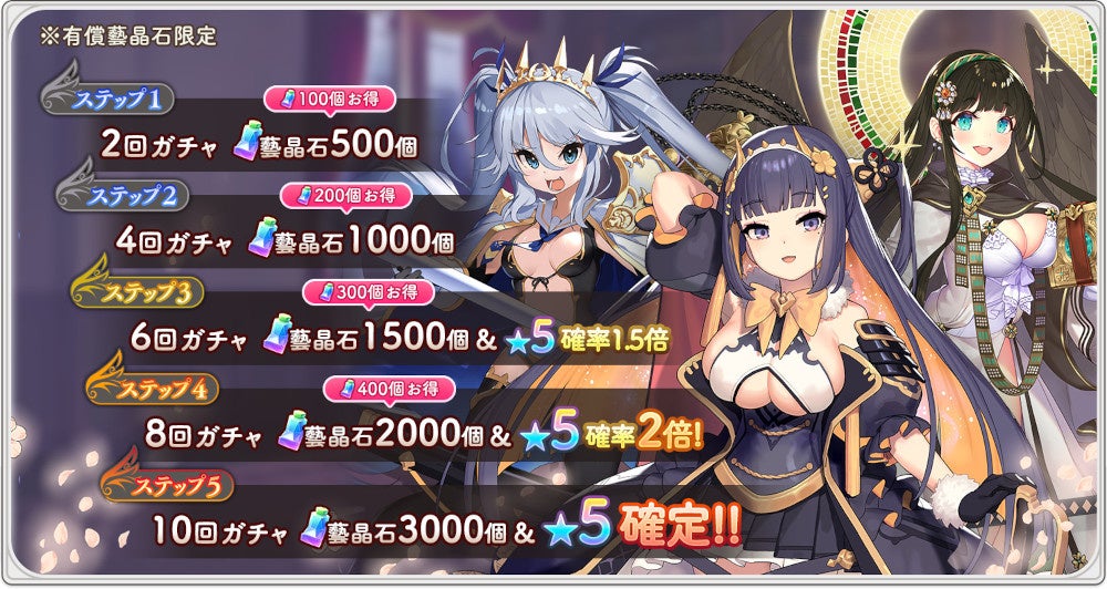 各ステップで価格、出現キャラクター数、★5出現確率が異なり、最後のステップでは★5キャラクター1体が確定となります。