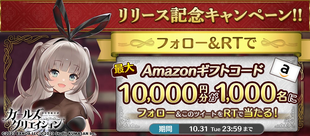 『ガ―ルズクリエイション』正式リリースを記念して、Amazonギフトコード最大10,000円分が抽選で500名様に当たるRTキャンペーンを開催いたします。