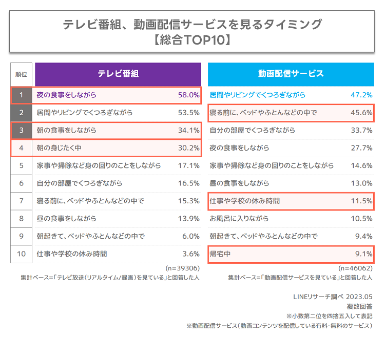 「テレビ番組」と「動画配信サービス」を見るタイミングの共通点として、食事中やリビングなどでくつろいでいるときに番組やコンテンツを楽しんでいる様子がうかがえます。