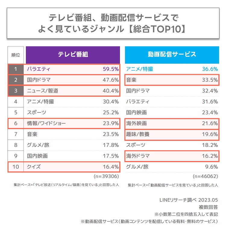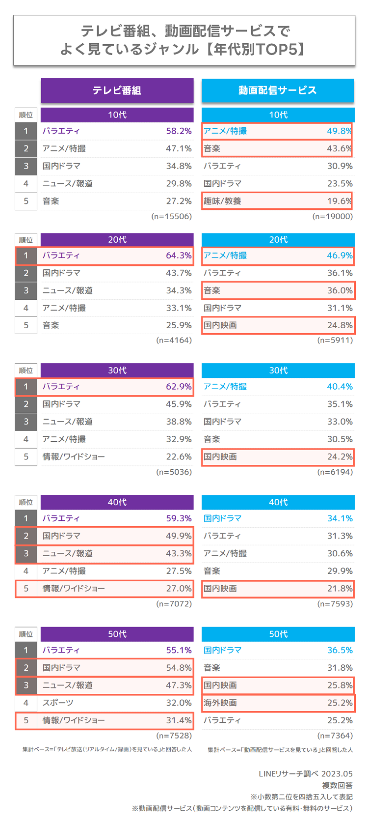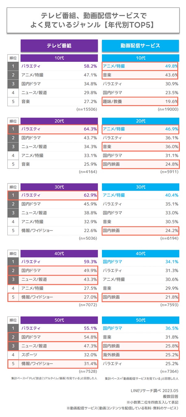 【LINEリサーチ】よく見ている番組・サービスのジャンルは「テレビ番組」では「バラエティ」が1位、「動画配信サービス」では「アニメ/特撮」が1位