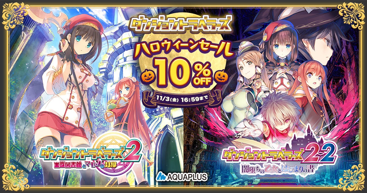 DMM GAMESで「ダンジョントラベラーズ 2 王立図書館とマモノの封印」PC版と「ダンジョントラベラーズ 2-2 闇堕ちの乙女とはじまりの書」PC版が10%OFFで購入できるハロウィーンセールを開催します。
