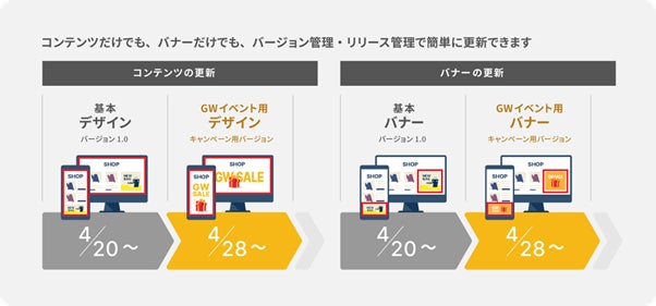 この2つの機能を組み合わせることにより、イベントや季節に合わせたデザインの自動切り替えや、特定の時間帯のみ一部のデザインレイアウトを変更してテストを行うなど、お客様のニーズに合わせた柔軟な活用をサポートします。