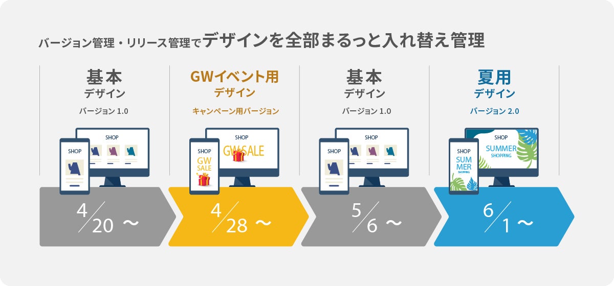 「GMOクラウドEC」ではすべてのページデザインを、一セットとして管理することができる「バージョン管理」と、バージョンの公開設定を一括で管理できる「リリース管理」の機能を新たに追加しました。