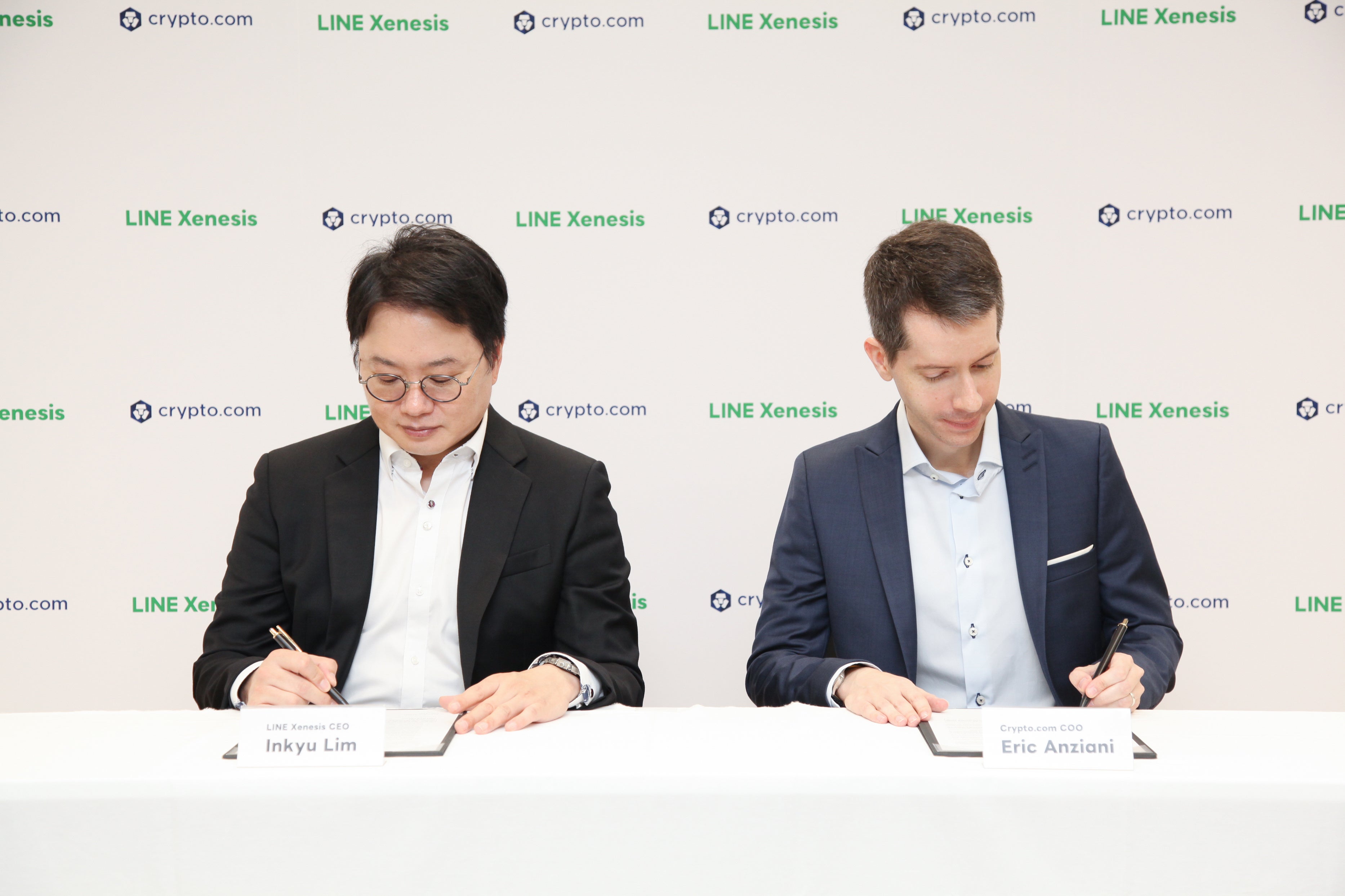 締結の様子(写真左より)LINE Xenesis 代表取締役社長CEO 林 仁奎(イム・インギュ) 、Crypto.com 最高執行責任者 Eric Anziani(エリック・アンツィアーニ)氏