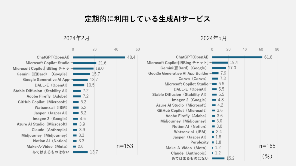 生成AIの利用状況について「日常的に使っている」「ときどき使っている」と回答した人を対象に、定期的に利用している生成AIツールをたずねました。(※3)2024年5月時点での回答が多かった生成AIツールは多い順に「ChatGPT(OpenAI)」(61.8%)、「Microsoft Copilot[旧Bingチャット](Microsoft)」(19.4%)、「Gemini(旧Bard)(Google)」(17.0%)となりました。