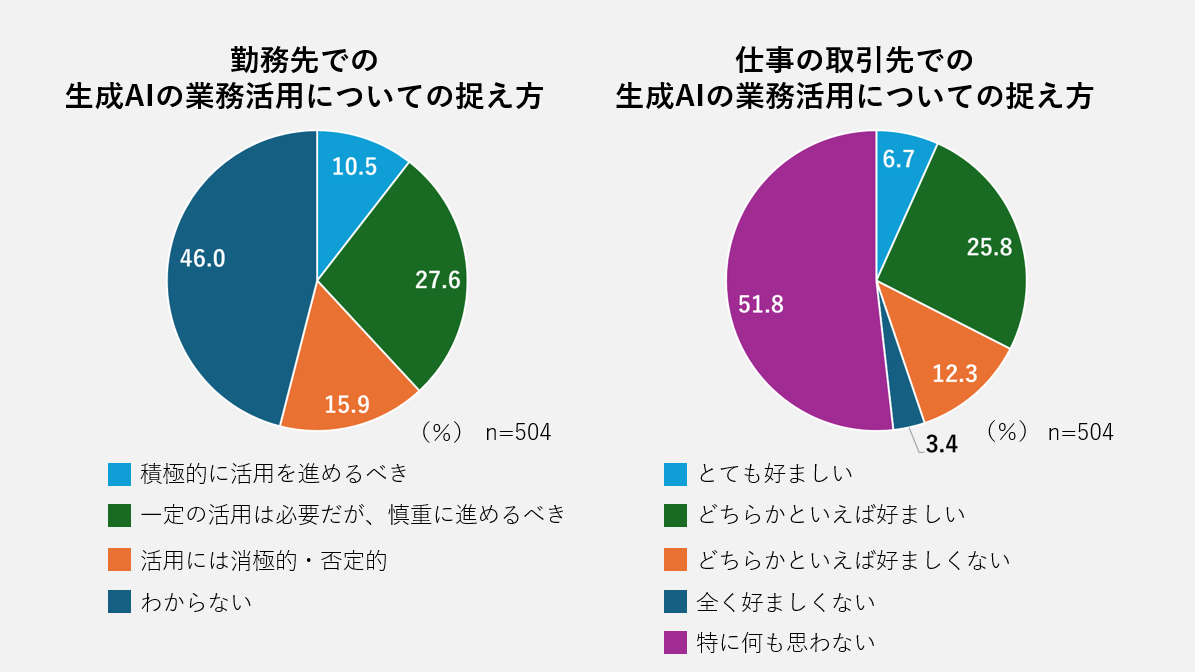 勤務先における生成AIに対する捉え方の調査においても「わからない」が最も多く、今後の生成AIの利用と普及には、知識向上と理解促進が重要と考えられます。
