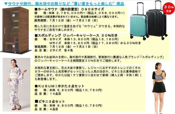 猛暑が常態化し、近年記録的な暑さが続いています。ナツ夏祭りでは、エアコンや接触冷感寝具、日傘など猛暑・節電対策におすすめの商品のほか、近年人気のサウナを自宅で楽しめる初展開の商品や、水着・浴衣、うなぎ蒲焼など“夏をもっと楽しむ”お買得商品を豊富に取り揃えます。