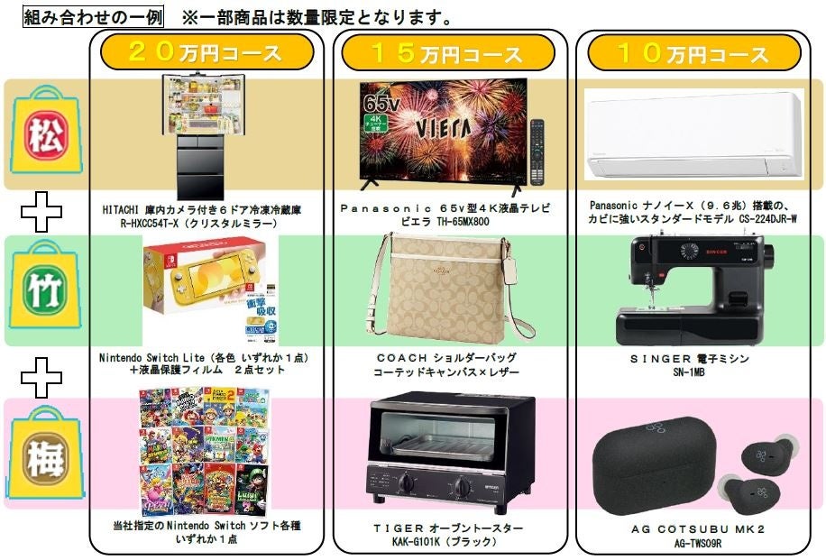 7月12日(金)~7月21日(日)まで、「松(本体価格 25万円コース/20万円コース/15万円コース/10万円コース)」「竹」「梅」それぞれの商品から1点ずつ自由に選び、17万通り以上の組み合わせからお得に購入できる「松竹梅プレミアムセット」企画を実施します。