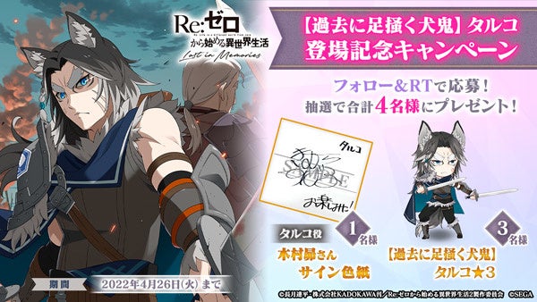 株式会社セガは、配信中の人気テレビアニメ「Re:ゼロから始める異世界生活」公式スマートフォン向けゲーム『Re:ゼロから始める異世界生活 Lost in Memories(以下、『リゼロス』)』にて、本日よりタルコ★3が登場する「【過去に足掻く犬鬼】ガチャ」を開催します。