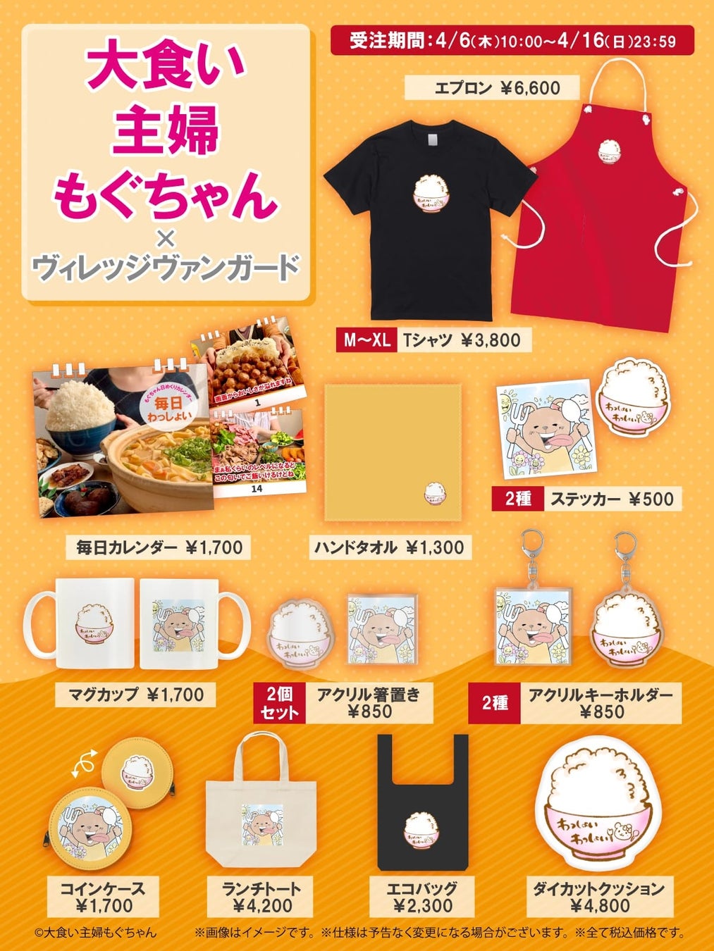 2023年4月6日(木)より、食べっぷりが癖になる【大食い主婦もぐちゃん】のヴィレッジヴァンガード限定グッズがオンラインストアにて発売決定!!なんだか食欲が湧いてくるかわいいグッズができました!期間限定のオンライン受注販売のみになりますのでお見逃しなく!