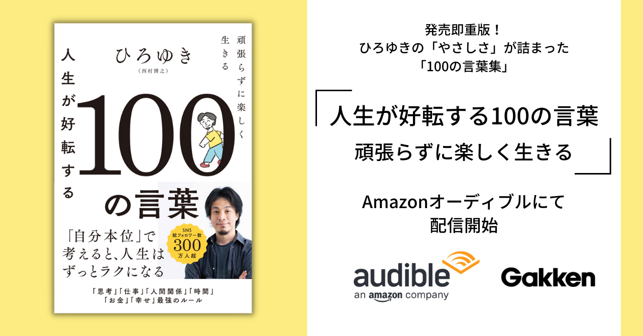 発売後即重版! ひろゆき著『人生が好転する100の言葉 頑張らずに楽しく生きる』、10月7日(金)からAmazonオーディブル(以下、Audible)にて配信開始