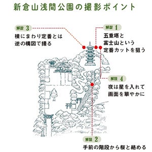 ●名所の撮り方をイラストと写真で分かりやすく解説! イラストによる図解と実際撮影された写真がセットになっているのでひとめで仕上がりイメージが確認できます。その他、おすすめの撮影時期や時間帯、必要なレンズや三脚の有無、アクセス方法なども紹介しています。