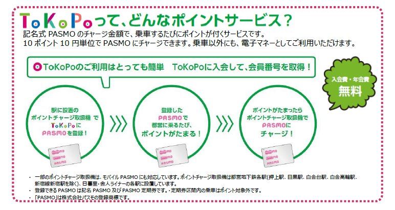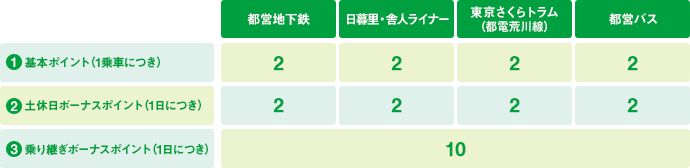 ToKoPo乗車ポイントに加え、都営地下鉄(浅草線、三田線、新宿線、大江戸線)及び日暮里・舎人ライナーのご利用時に、同一月内に同一運賃区間の乗車回数に応じてポイントを付与します。