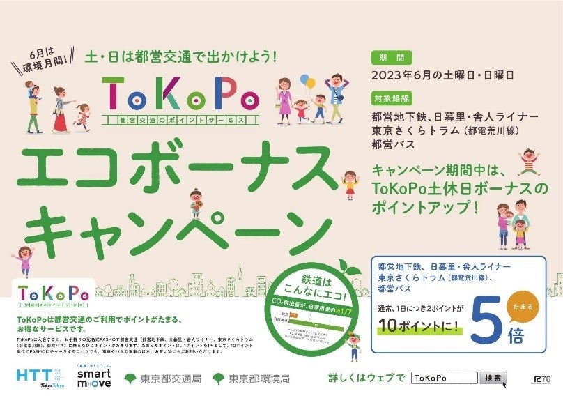 このたび、6月の環境月間にあわせ、東京都交通局では、都営交通の会員制ポイントサービス「ToKoPo(トコポ)」を活用した「ToKoPo エコボーナスキャンペーン」を実施しますので、お知らせいたします。6月の週末に都営交通をご利用いただくと、通常ポイントに加えて、エコボーナスポイントを進呈します。まだご入会されていない方は、是非この機会にお申し込みいただき、「ToKoPo」で、地球とお財布にやさしいサステナブルなお出かけをしませんか。