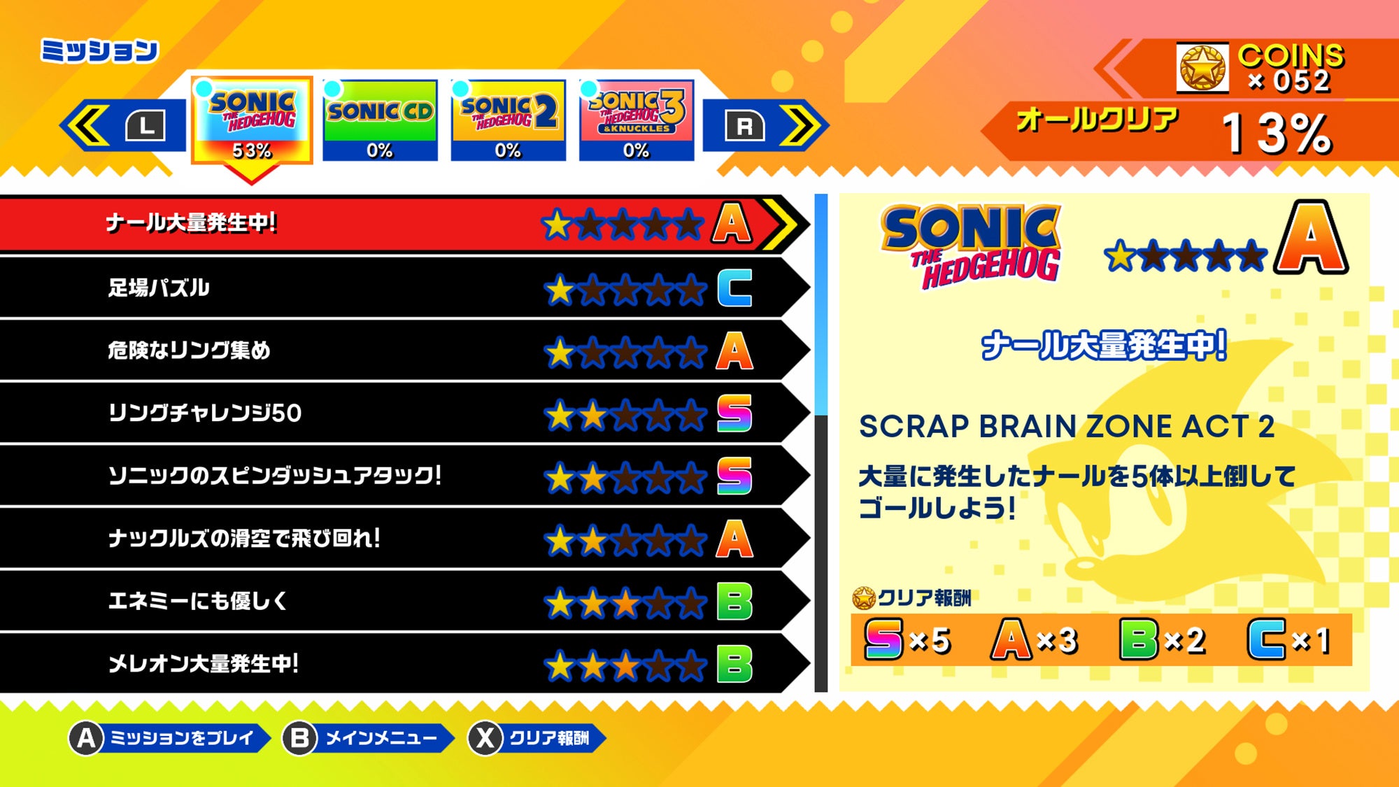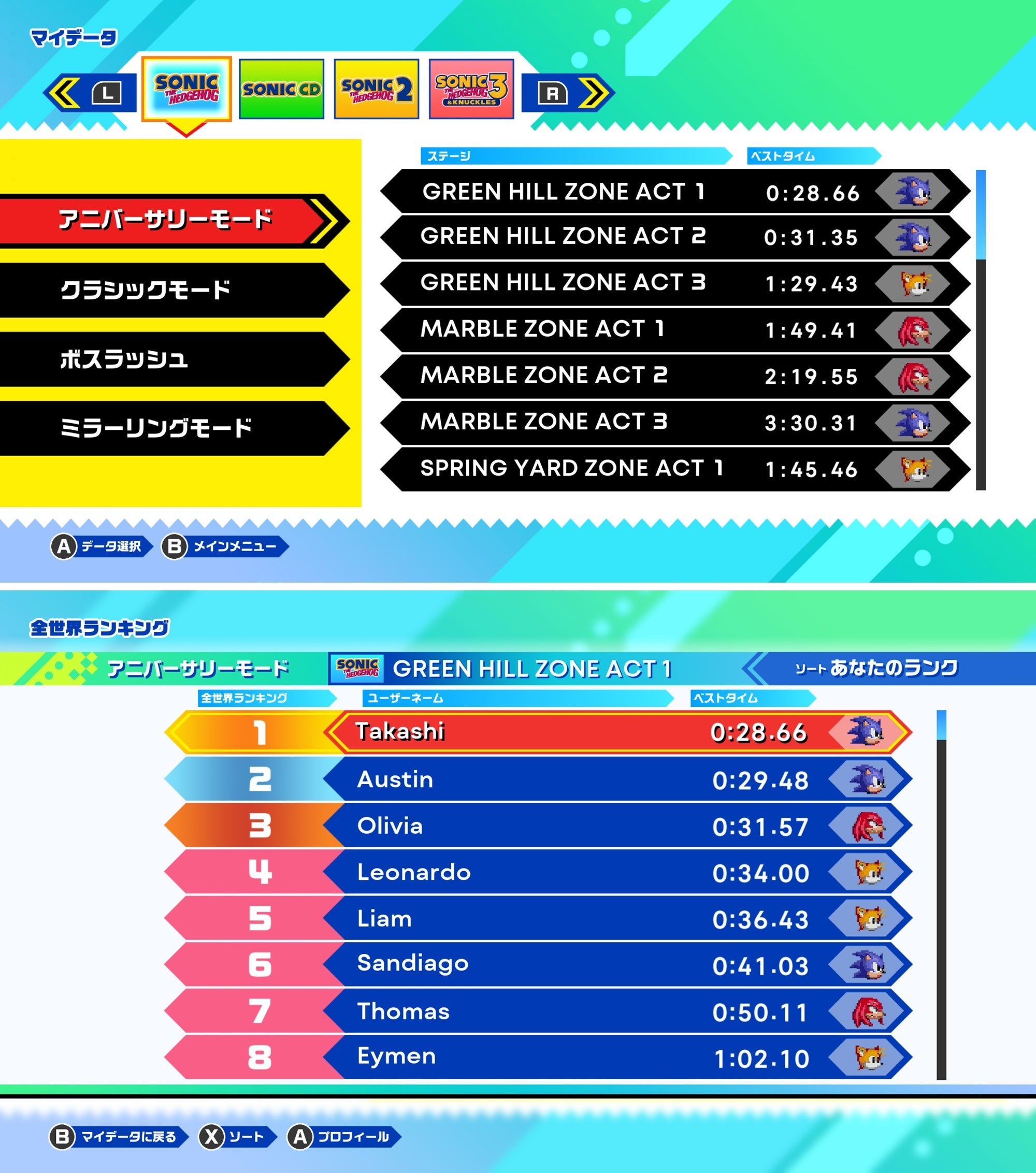 「アニバーサリーモード」では、キャラクターを「ソニック」「テイルス」「ナックルズ」から選んでプレイすることができます。