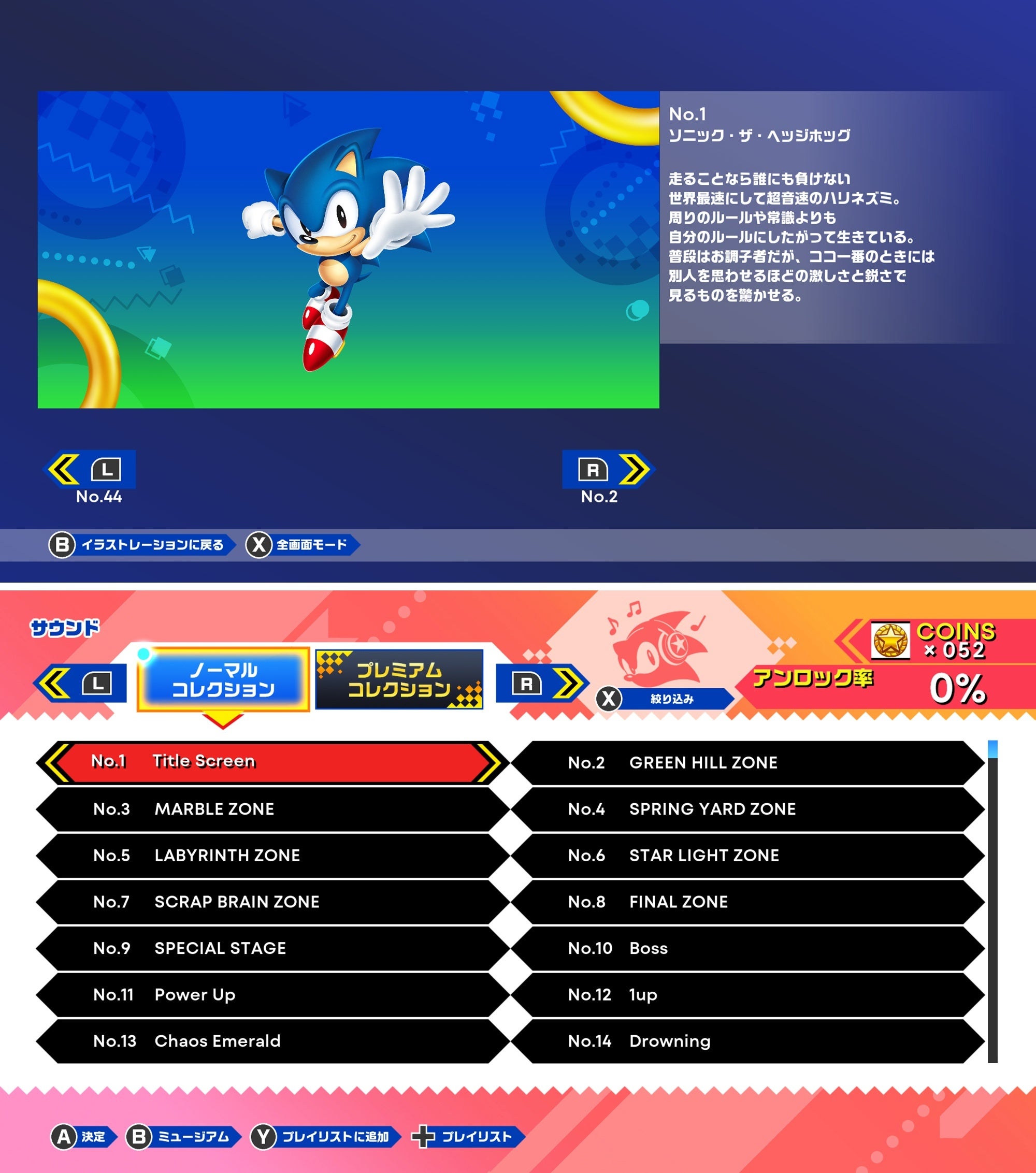 ・ミュージアムのサウンドに楽曲追加(『ソニックスピンボール』『カオティクス』『ソニック3Dブラスト』から全73曲)