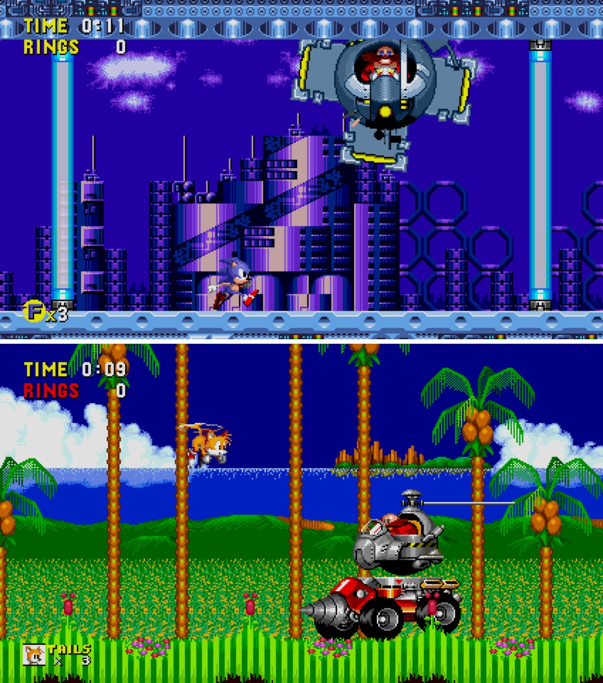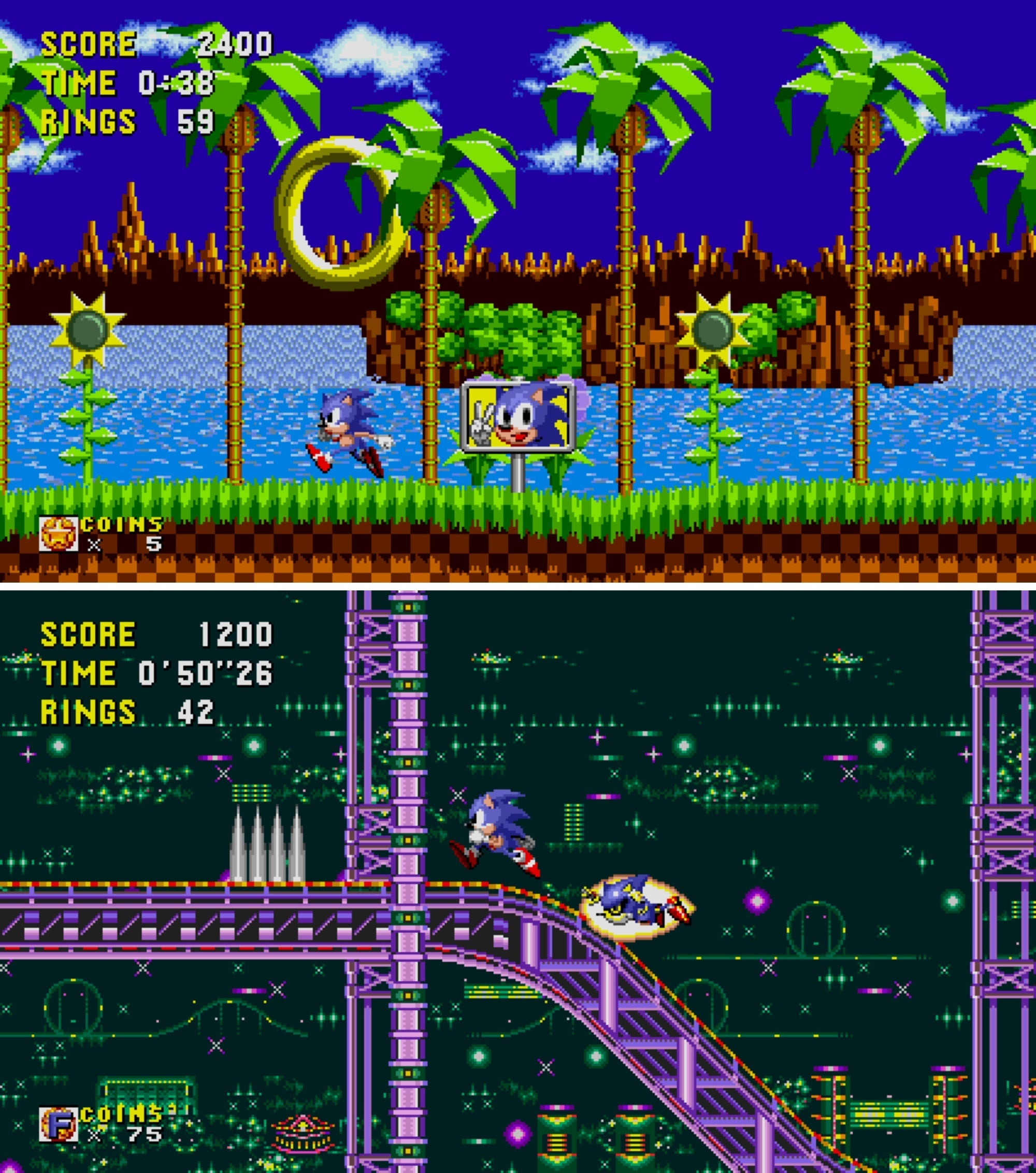 「アニバーサリーモード」では、16:9の大画面でゲームが楽しめるだけでなく、タイムオーバーとコンティニューがなくなったことで、ゲームオーバーを気にせずソニックのスピードを楽しむことができるようになりました。