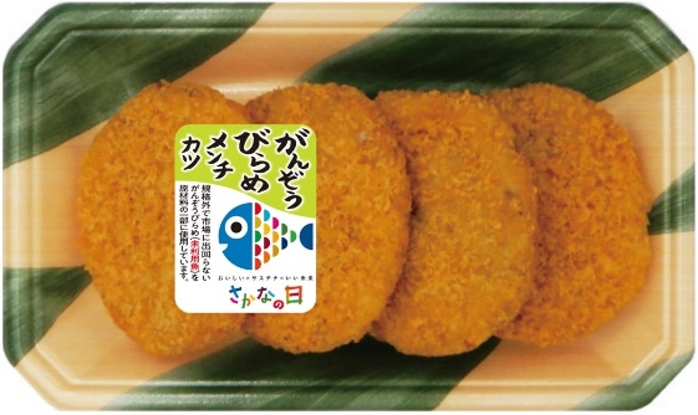 特長:規格外で市場に出回らない千葉県産未利用魚のがんぞうびらめを原料の一部に使用したメンチカツです。ひらめ独特の、クセのない、あっさりとした風味がします。