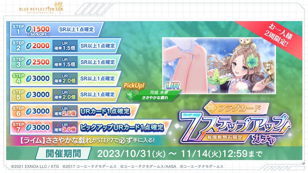 キャラクターステップアップはSTEP7まで引き終わった時点で、フラグカードステップアップは14回(2周目のSTEP7まで)引き終わった時点で終了となります。