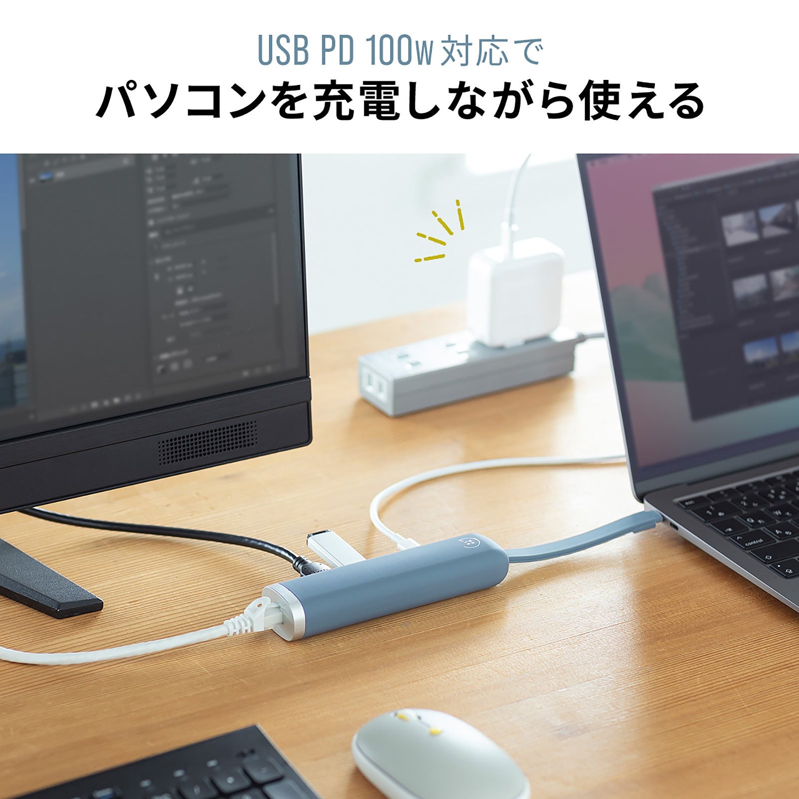 USB Type-Cでの「USB Power Delivery(USB PD)」に対応しており、接続したパソコンへの給電も本製品経由で可能です。最大100Wまでの充電に対応しています。
