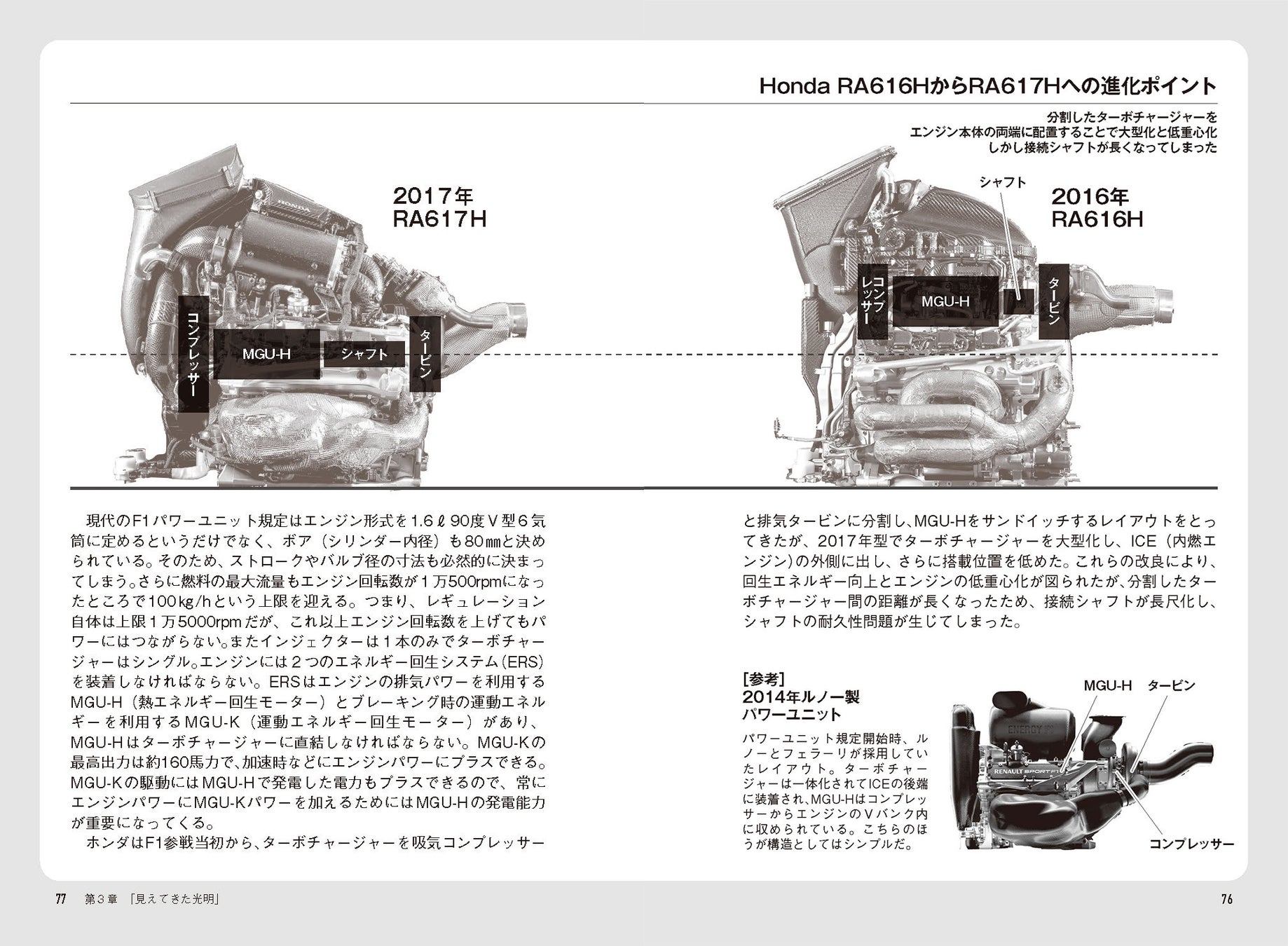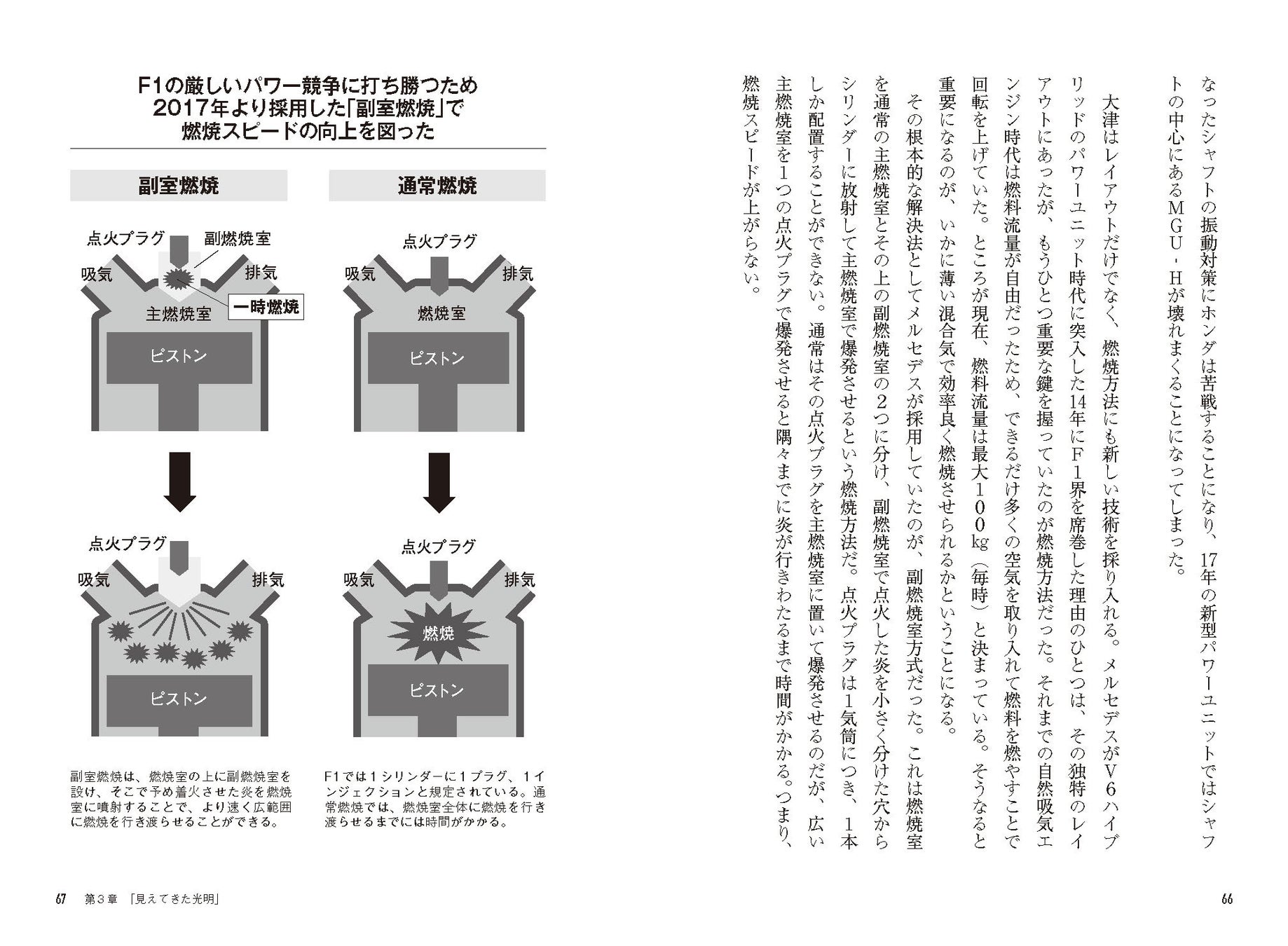 本書は、F1初心者でも楽しく読めるように専門用語もわかりやすく説明されているだけでなく、豊富な写真や図解も掲載されています。また、ホンダのパワーユニットの進化、エンジン燃焼についての解説なども掲載されているので、F1ファンの知識欲も満たす内容になっています。