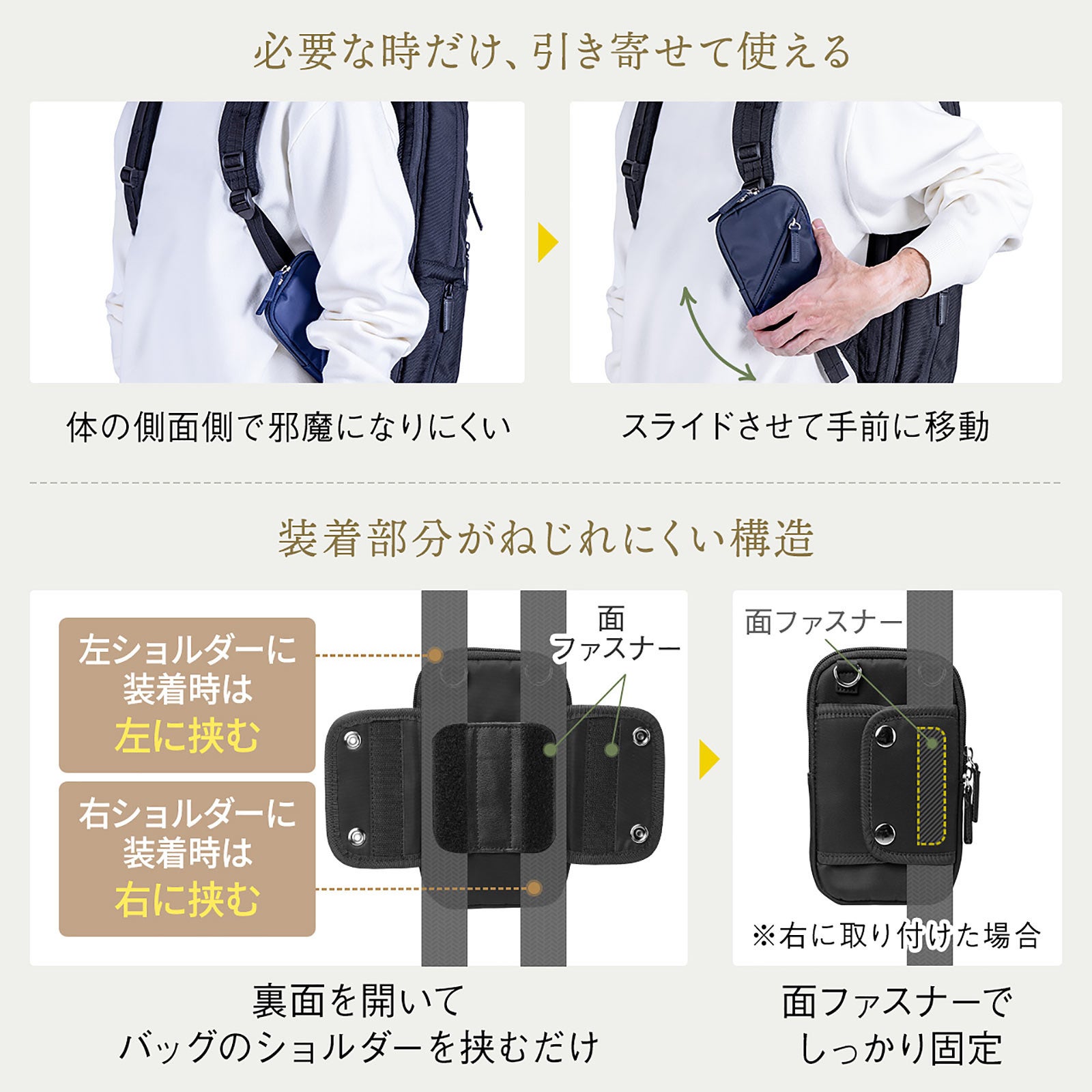 ポーチは、必要な時だけ引き寄せて使えるスライド移動が可能です。装着部分は、面ファスナーでしっかり固定し、ポーチがねじれにくくなっています。ストラップを使用して肩にかけて使うことも可能です。