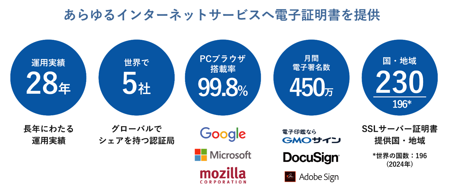 グローバルでシェアを持つ世界トップ5社(※1)の中で唯一の国産認証局「GlobalSign」を保有しており、国内外の主要な電子契約・署名ベンダーへ認証技術を提供しています。また自社開発で導入企業数350万社以上(※2)の「電子印鑑GMOサイン」との連携により、コストパフォーマンスの高いセキュアなサービスを多くの自治体・企業様等にご利用いただいております。