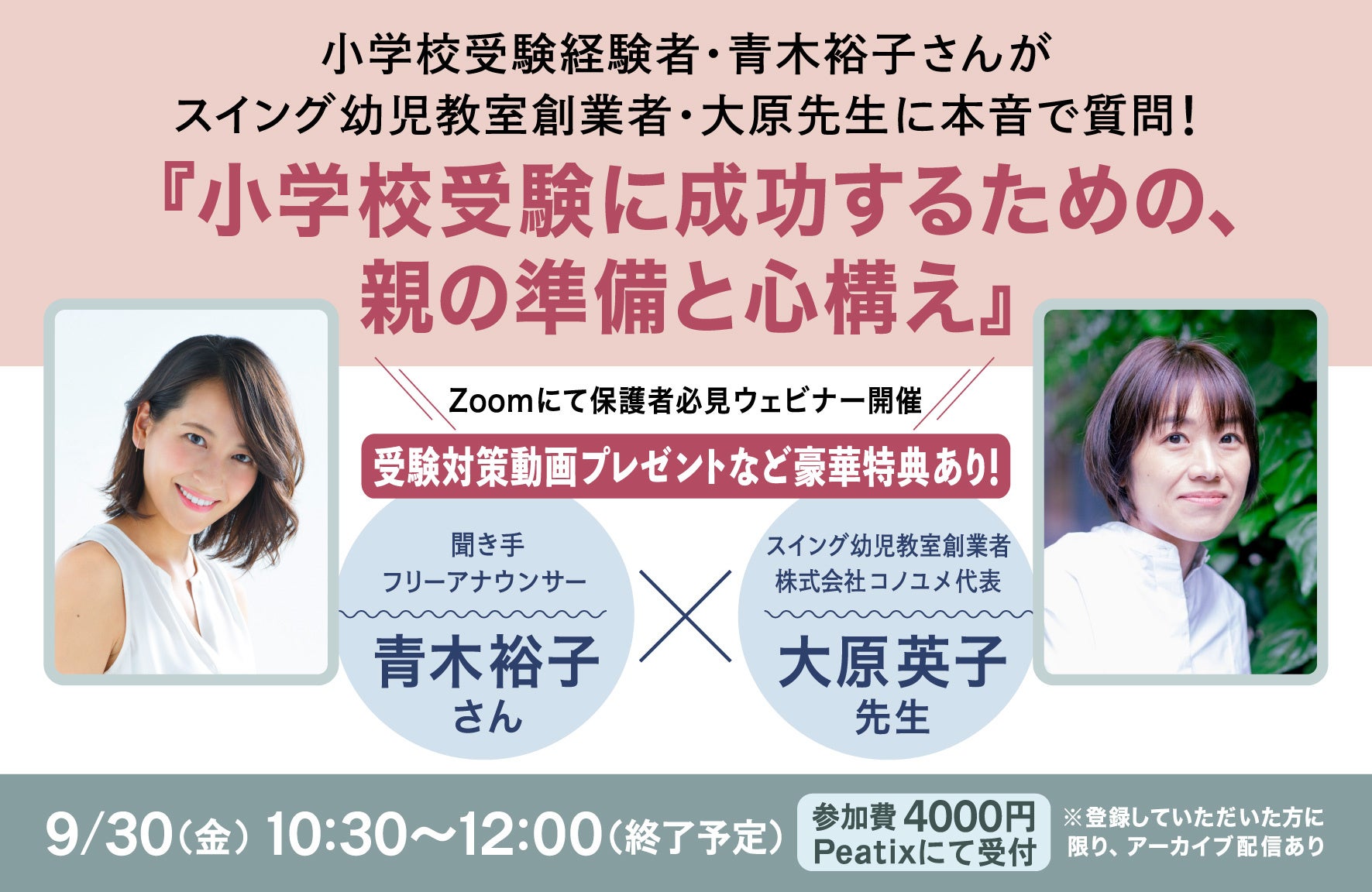 小学校受験直前期! 小学校受験体験者・青木裕子さんがスイング幼児教室創業者の大原英子先生に質問。『小学校受験に成功するための、親の準備と心構え』保護者必見ウェビナーを開催します。