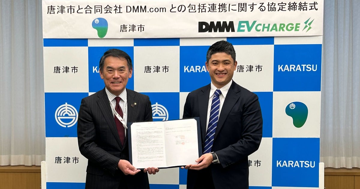 合同会社DMM.com(本社:東京都港区、会長兼CEO:亀山敬司、以下「DMM」)と佐賀県唐津市(市長:峰達郎、以下「唐津市」)は、地域課題の解決に向けて、相互の知見や資産などを活かし、EV充電インフラ整備をはじめとした地球温暖化対策に関し協力することで、市民生活の利便性を向上させ、市域の経済循環につなげていくことを目的とし、連携協定を締結いたします。