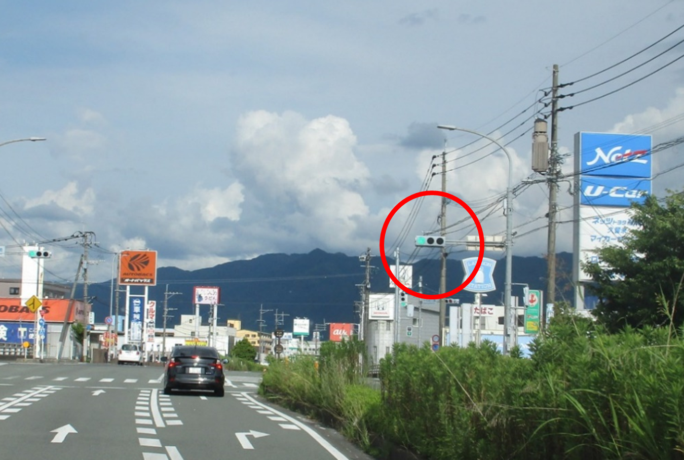 右折車線に入り停止線まで車両を進めると運転席からは信号機が確認できない。