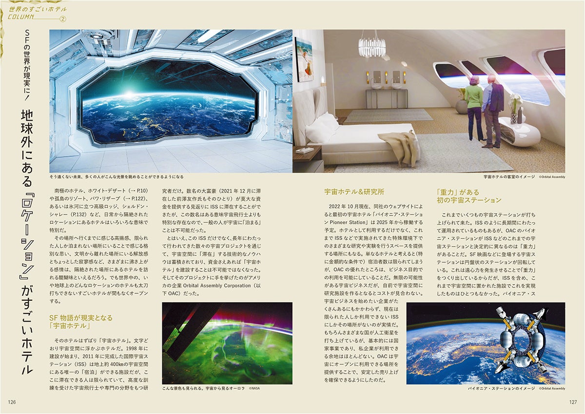 水際対策が緩和され、全国旅行支援もスタート。旅に関心が高まっている今、「地球の歩き方」が世界のすごいホテルを集めた【旅の図鑑】を発売しました。ロケーション、絶景、自然、歴史、デザイン、エコがすごい至極の宿126軒を、美しい写真や旅の雑学とともに徹底紹介。超豪華なホテルから庶民的なロッジやキャンプまで、そこに泊まること自体が旅の目的になる特別な宿のみ厳選しました。SFの世界が現実となる「宇宙ホテル」とは?! ホテルにまつわるコラムやトリビアも満載の一冊です。