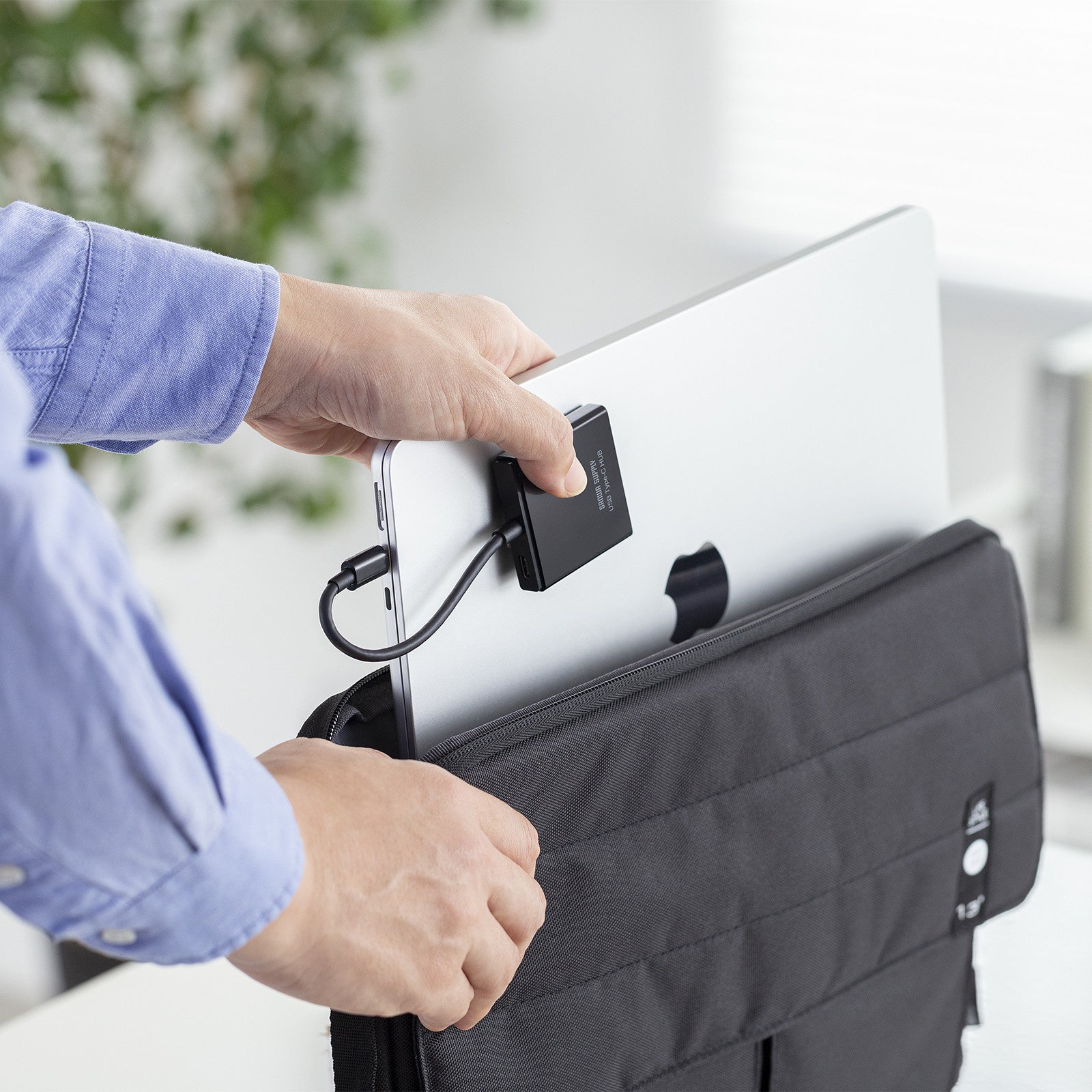 カバンの隙間にすっぽり入る薄型サイズで持ち運びにも便利です。ケーブル直付けなのでケーブルをなくす心配がありません。