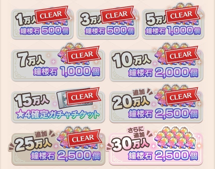 また、30万人の追加目標でさらに「鐘楼石」が2,500個貰えるキャンペーンを実施いたします。