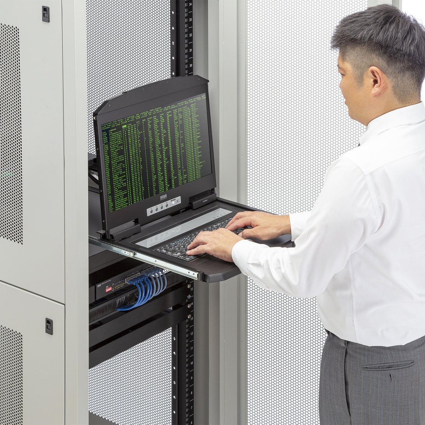 サーバー管理に必要なモニタ、キーボード、マウスのコンソール類を省スペースに設置・収納できるため、作業効率が格段にアップします。