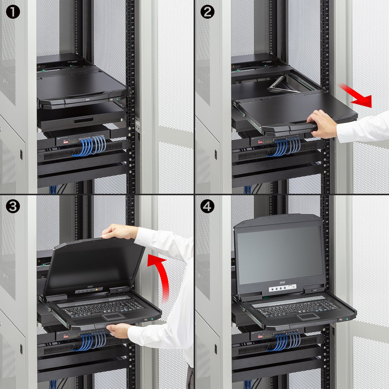 スライドレール構造により、未使用時は1Uサイズのサーバーラックにすっきり収納できます。