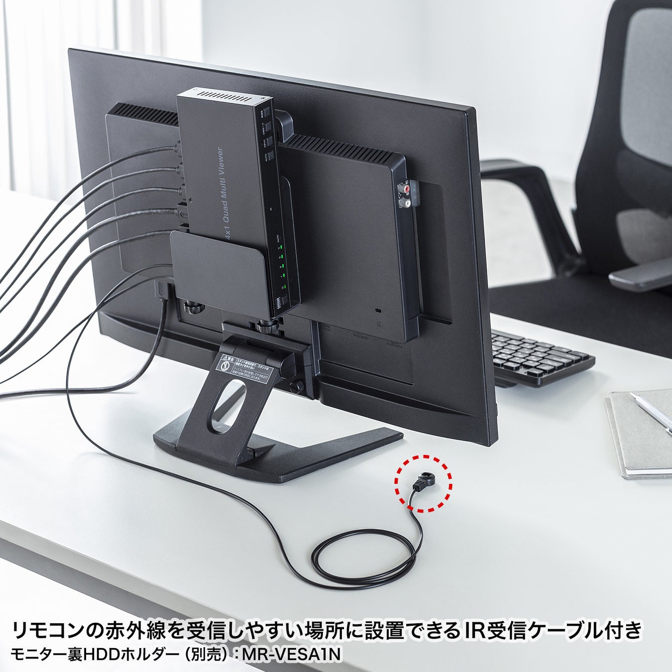 リモコンの赤外線を受信しやすい場所に設置できる、IR受信ケーブルが付属しています。