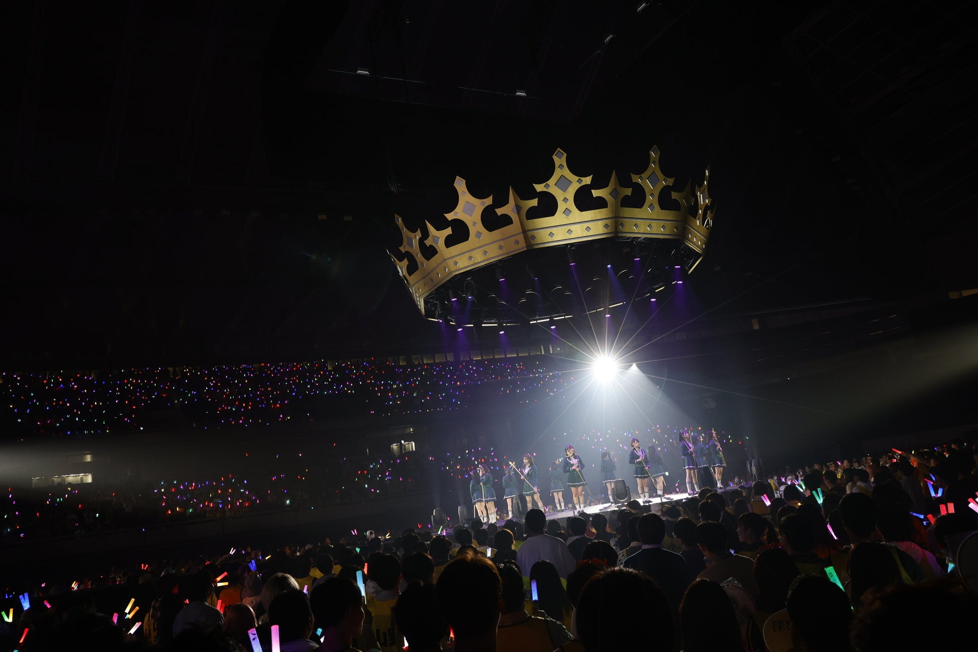コンサート後半のブロックは、東京体育館でのコンサートにぴったりなアッパーチューン『体育館ディスコ』でスタート。ミラーボールが放つまばゆい光によって、東京体育館が高揚感あふれるディスコに様変わりした。≒JOYは勢いそのままにコンサートの盛り上がりを加速させ、『笑って フラジール』ではトロッコに乗って場内を巡りながら会場いっぱいに笑顔と歌声を届ける。『大空、ビュンと』の曲中にはメンバー1人ひとりの手書きのメッセージがLEDビジョンに映し出され、ファンとの絆をより強固なものに。グループ初のラブソングとして昨年10月にリリースされた2ndシングル表題曲『初恋シンデレラ』が始まると、巨大なティアラ型の照明装置が登場し、センターステージで歌い踊るメンバーを鮮やかに照らし出した。