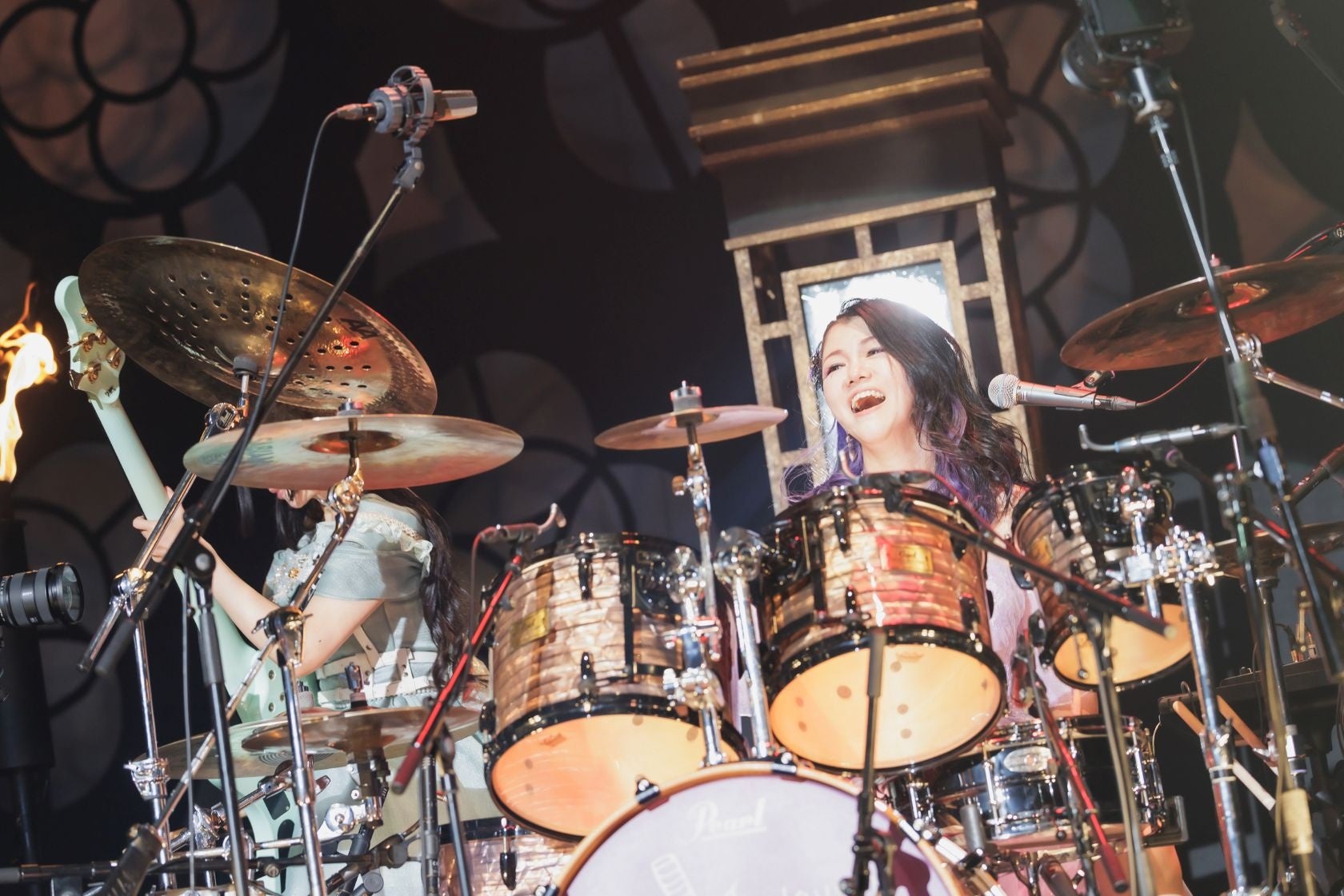 豊洲PITは無期限活動休止を惜しむ1,000名のファンが待ち構える中、オープニングSEにのってステージに登場したメンバーは2017年リリースの「We Are」でステージをスタート。背中の開いた黒のドレスに身をまとったRe:NOはスタートから圧倒的なシャウトを見せると、赤いコスチュームのYoshiもそれに呼応するかのようにギターをかき鳴らし、ピンクのドレスのトキも鮮やかなメロディを奏でていく。