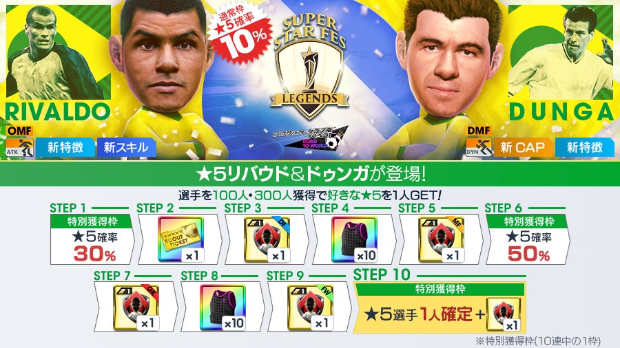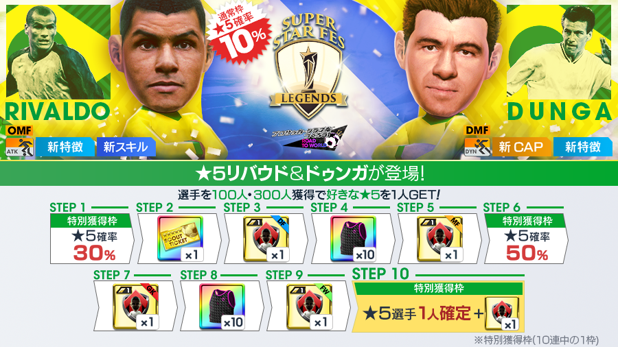 ブラジルのレジェンド「ドゥンガ」、「リバウド」が新★5選手として登場する特別なスカウトです。通常枠の★5確率は10%です。