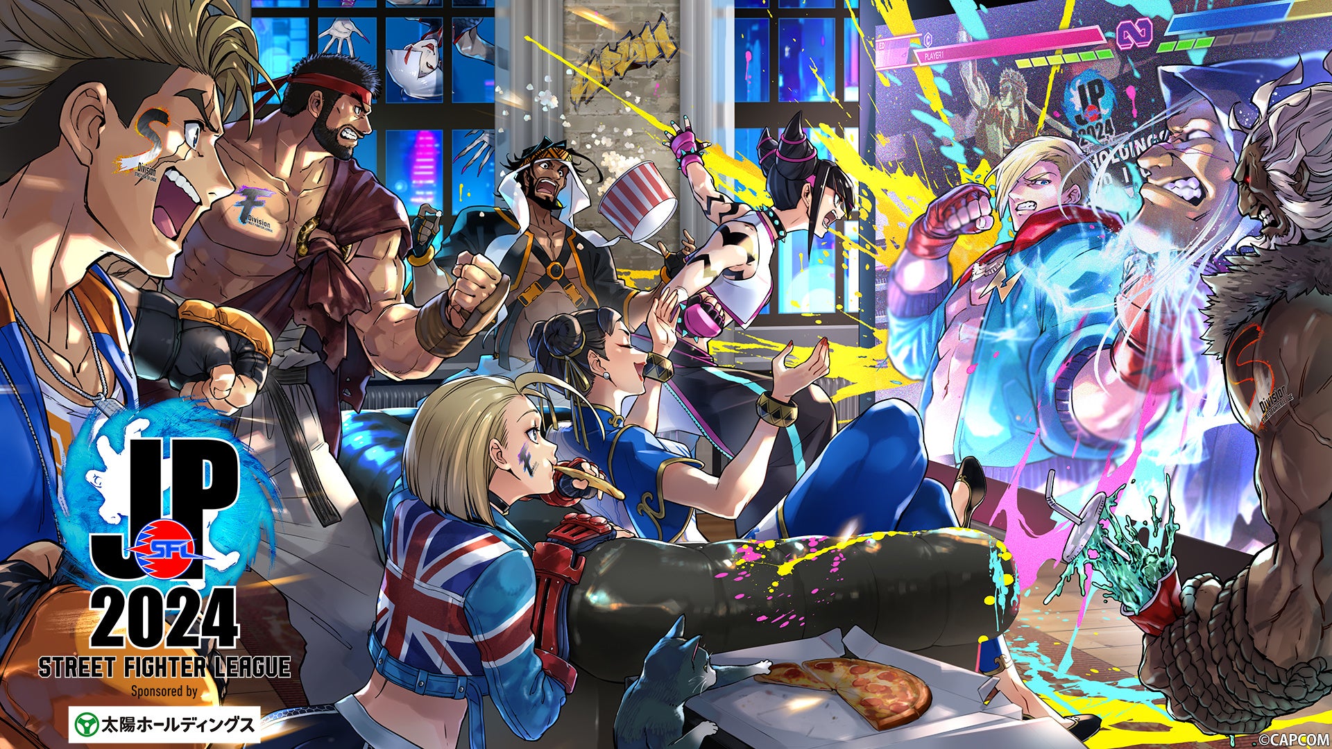 「SFリーグ」を観戦するキャラクターたちの様々な表情やキャラクターに施されたディビジョンロゴのペイントなど、「ストリートファイターリーグ」ならではの特色が光る作品となっております!