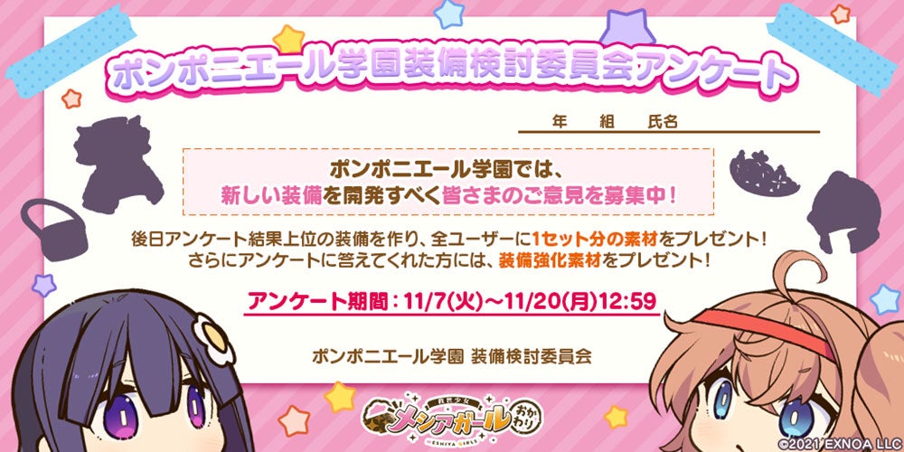 ポンポニエール学園装備検討委員会では、新しい装備を作成するにあたり、アンケートを行うことにしました。