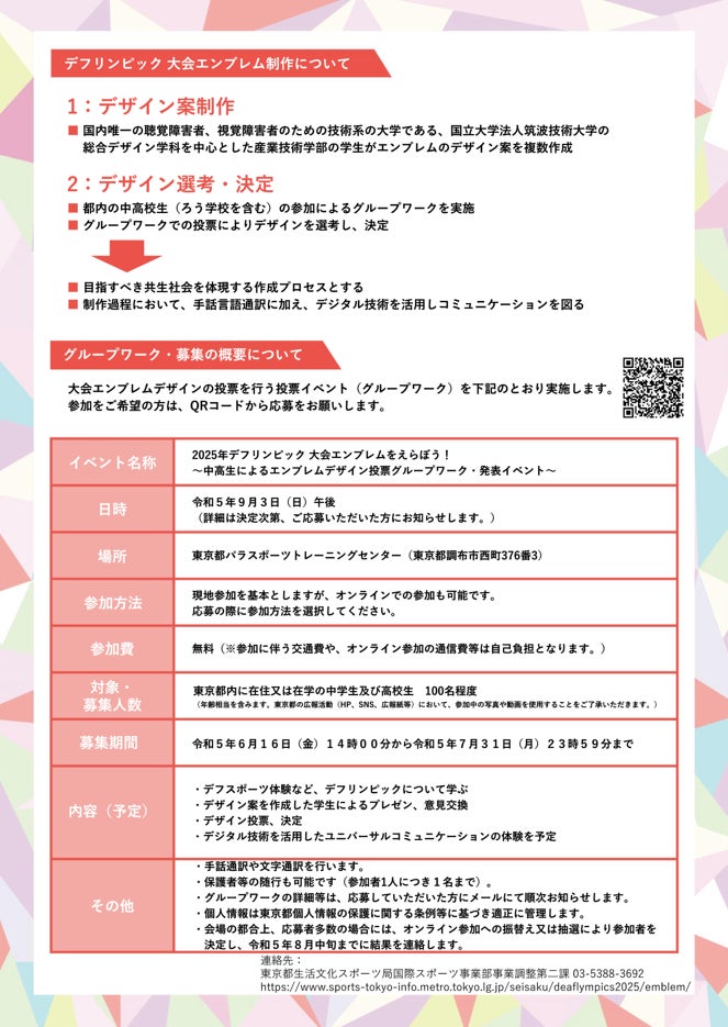 9月に実施する、投票を行うイベント「2025年デフリンピック 大会エンブレムをえらぼう!」に参加する中高生を募集するため、お知らせします。